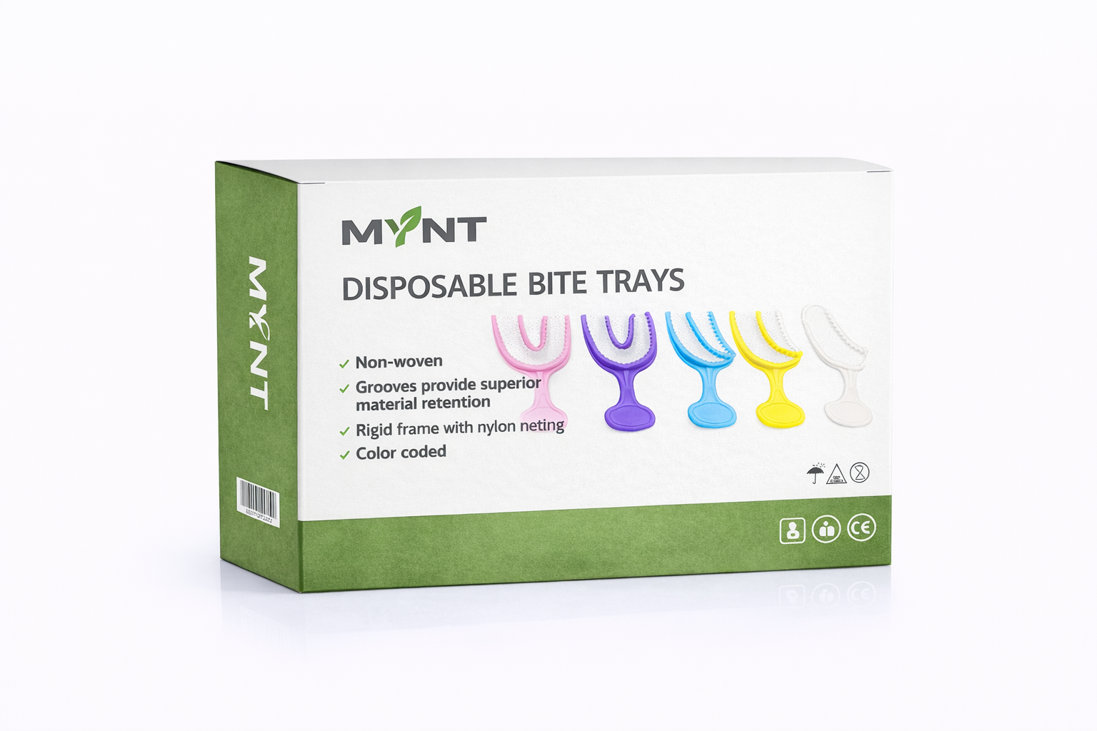 | MYNT-1063 | Disposable Bite Trays – Color Coded – Woven Net – Green – Posterior | BOX50 / CS10 |